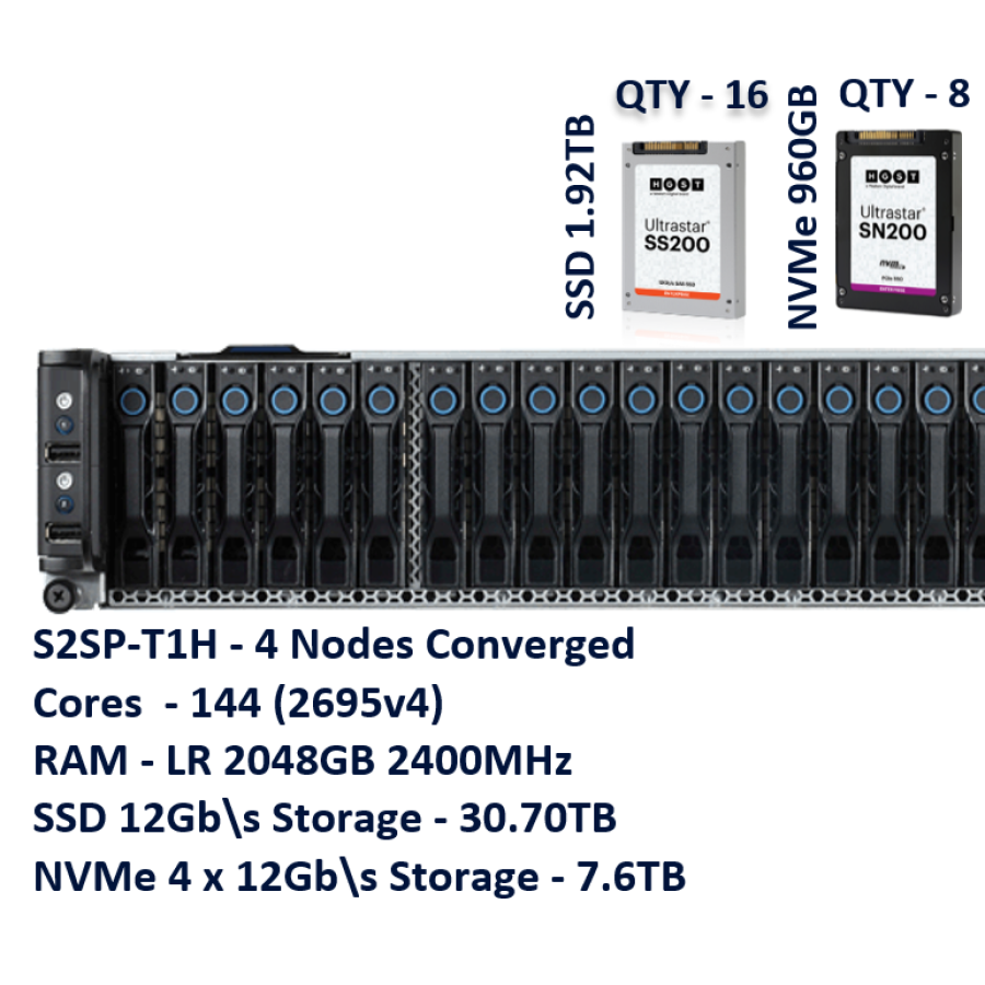 The S2SP T1H is a 2U, 4 Node, Tier 1 Hybrid Storage Server ideal for: Storage Nodes requiring hybrid performance of SSD and NVMe. Hyperscalers offers standardized, pre-engineered building blocks across four (4) performance-tiers enabling customers to pick and choose to suit their varying workload demands. The S2S Tier 1 Storage Server boasts: 144 Cores (2695v4), 2048GB LR RAM, 30.70TB 12Gb/s SSD Storage, 7.68 TB NVMe storage and four (4) x 10G SFP+ ports or four (4) x 40G QSFP+ ports.