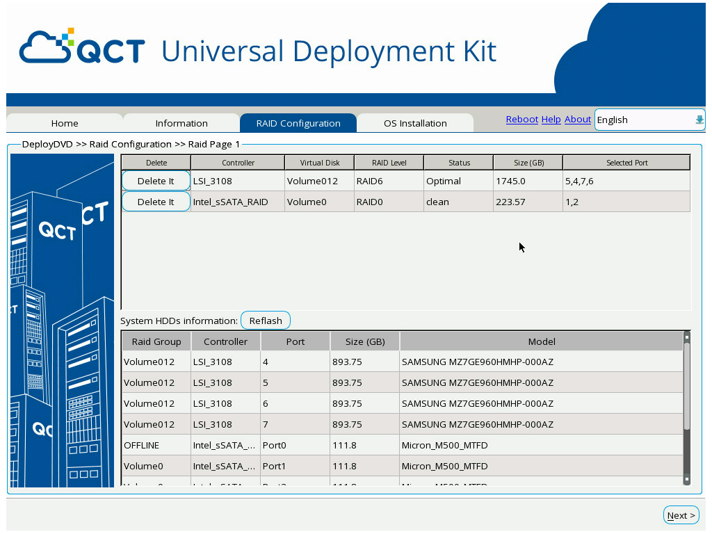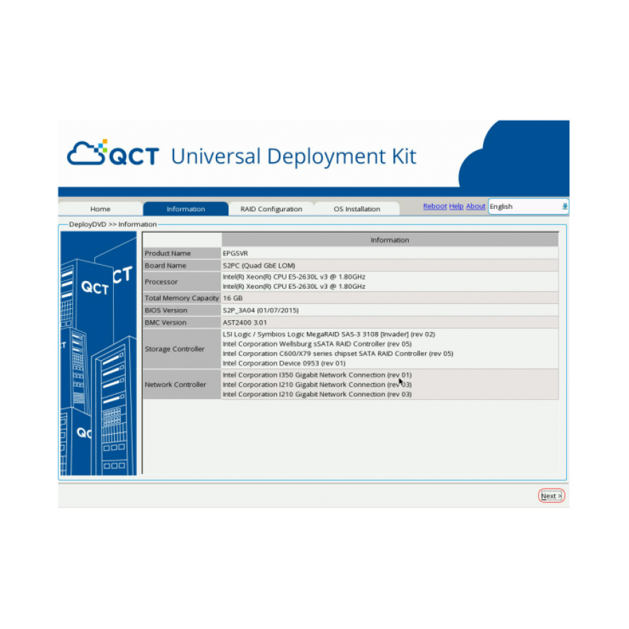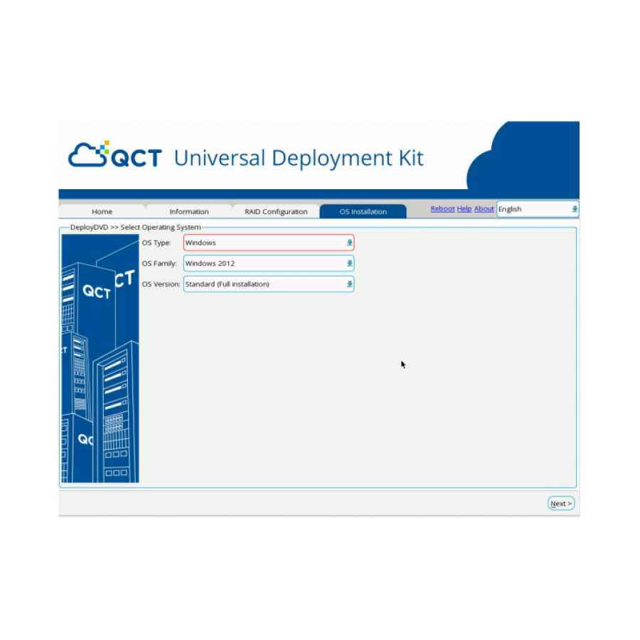 | QCT Universal Deployment Kit (UDK) wizard helps reduce the complexity and time on setting QCT systems. It allows you to install operation system (Window and Linux OS) as you prefered. Handliy using interface (GUI) provides hardware information in one page. It's web interface guides you to install the operating system and RAID configuraion step by step, locating and retriving drives automatically.Different RAID levels are listed for your requirement. If you need to change drive device name for management purpose, UDK provides Re-name feature as your modification purpose. |